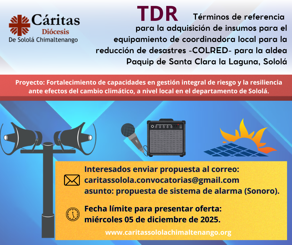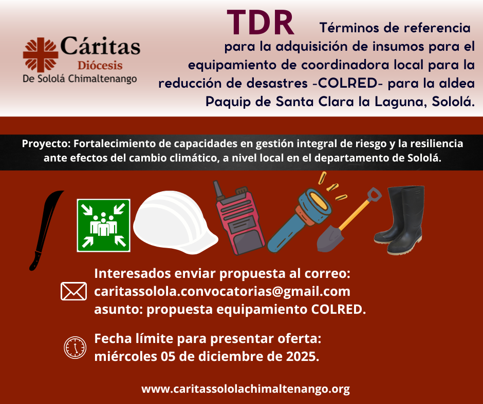 Términos de Referencia para la adquisición de insumos para el equipamiento de coordinadora local para la reducción de desastres -COLRED- para la aldea Paquip de Santa Clara la Laguna, Sololá.
